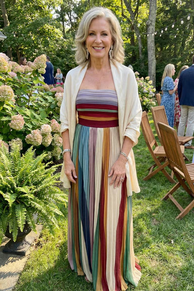 Thessaly | Elegant Pleated Strapless Striped Maxi Dress