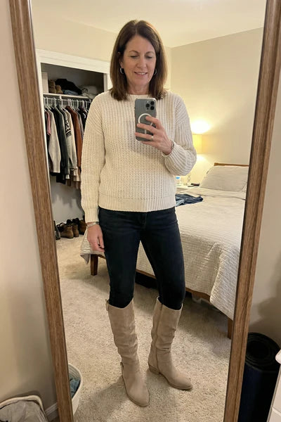 So glad I grabbed both the sweater and boots together for the discount! The boots fit perfectly without squeezing my calves, which is always my biggest struggle. The sweater is incredibly soft and they look amazing styled together. Best purchase I've made in a while!
